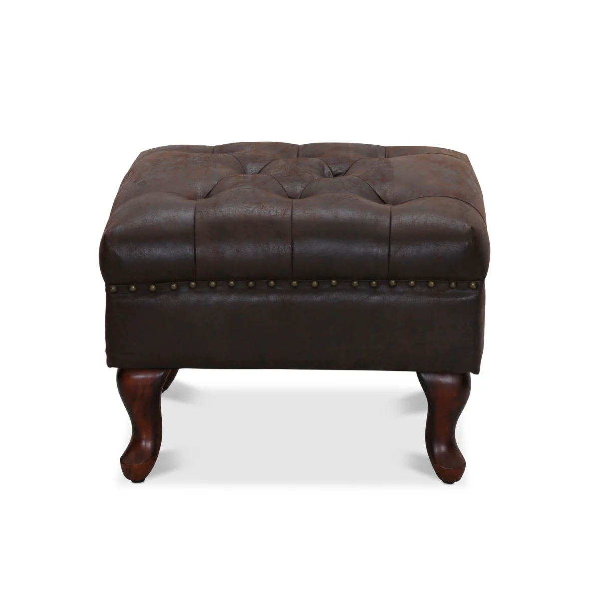 En praktisk och snygg fotpall med knappar. Denna varianten är klädd i ett brunt vintagetyg med en rad av nitar som ramm.