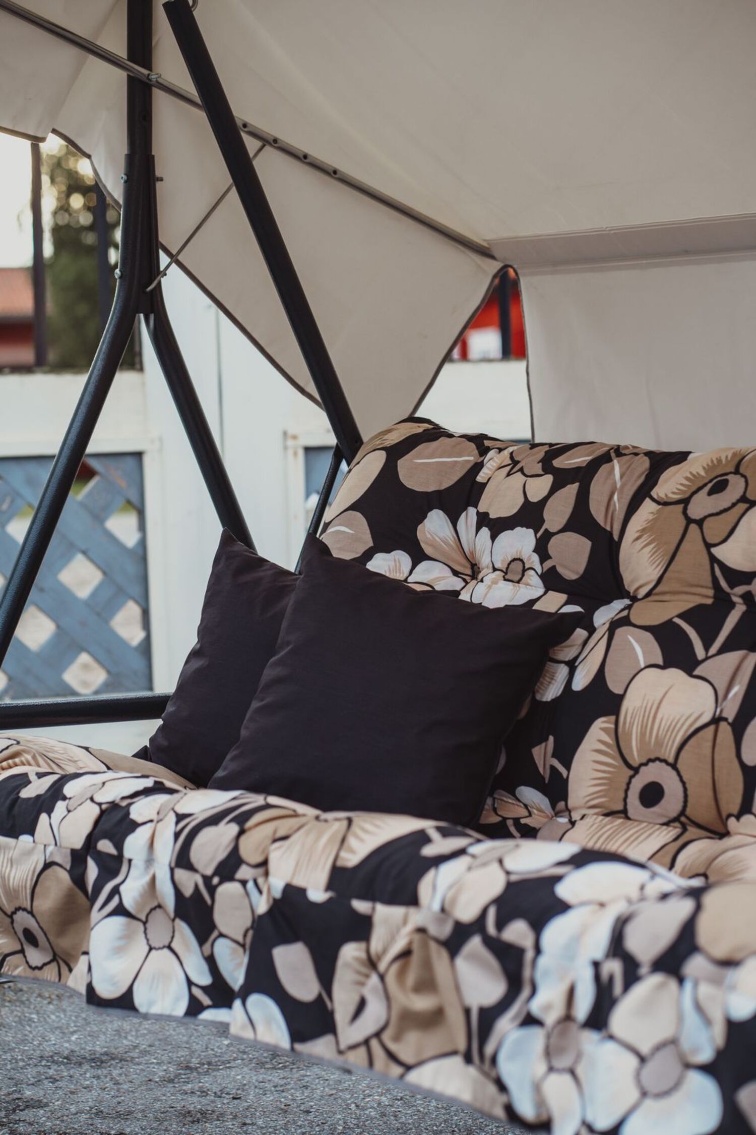 Ge uteplatsen ett harmoniskt lyft med Hammock Suvi 3‑p, här klädd i elegant grå‑beige blommönstrade dynor som skapar en mjuk och stilren atmosfär. Den stabila konstruktionen bygger på en grå pulverlackerad stålrörsstomme, noggrant förbehandlad med Bonderite® för att stå emot väder och vind. Rygg och sits består av hållbart förzinkat metallnät – en lösning som både ger styrka och ett behagligt sviktande stöd.